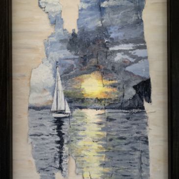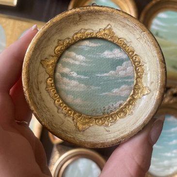 Acrylic, abstract landscapes, street scenes & clouds. Some miniature, some on gilded canvas, & some in restored vintage frames or vintage wooden plaques.