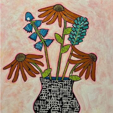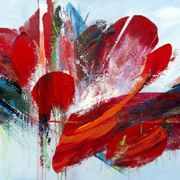 I use heavy-body acrylic on canvas, which gives my art a dimensional feel. Combined with fluid, transparent ink, I create bold, vibrant, and energetic paintings of abstract flowers with happy feelings.