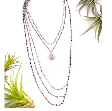Multilayer jewelry featuring all natural minerals with unique pairings of design style and materials. Each individual mineral is hand knotted and fused together using 14K gold, sterling silver or gunmetal wire.