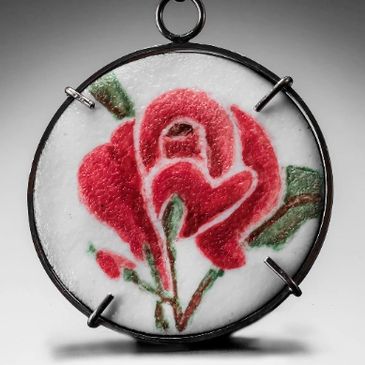 I make jewelry of vitreous glass melted onto metal for the contemporary woman. The process involves a design including multiple firings of sifted or wet packed glass onto metal followed by careful application of enamel paints, beads, stenciled elements or bits of fine silver wire or foils.