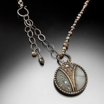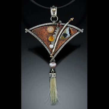 Jewelry created by the fabrication method, using 14k gold, sterling silver and copper set with semi-precious gems and freshwater pearls. Each piece is individually hand crafted.