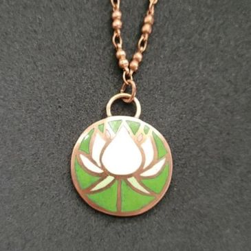 My artwork medium is colorful enamel jewelry. I sift or wet pack vitreous enamels onto hand wrought metal pieces of pure copper or brass. After each layer is applied, the piece is then fired. Multiple layers of enamel, usually from 8 to 20, are layered and fired onto each piece and then hand painted.
