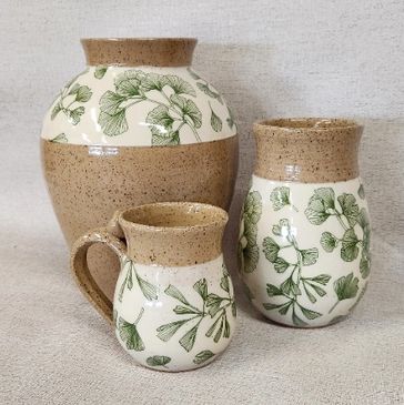 My work is both functional and non-functional ceramic, made both on the wheel and hand-built. I use handmade prints over hand painted detail work. I use a variety of glazes together, and fire to Cone 6.
