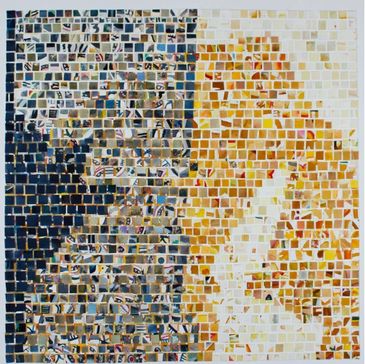 Using watercolor paintings that I have made, I cut them up into squares. These squares are glued onto paper and arranged into a grid as an abstract piece