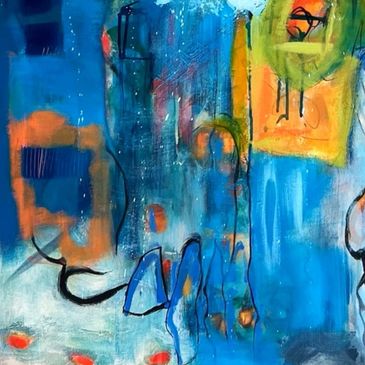 I create colorful abstract art, using diverse tools to construct and deconstruct, crafting dynamic, layered, textured compositions full of movement and joy.