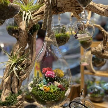 Glass Terrarium Art arranged with live plants such as Cacti, Succulents, Air Plants.