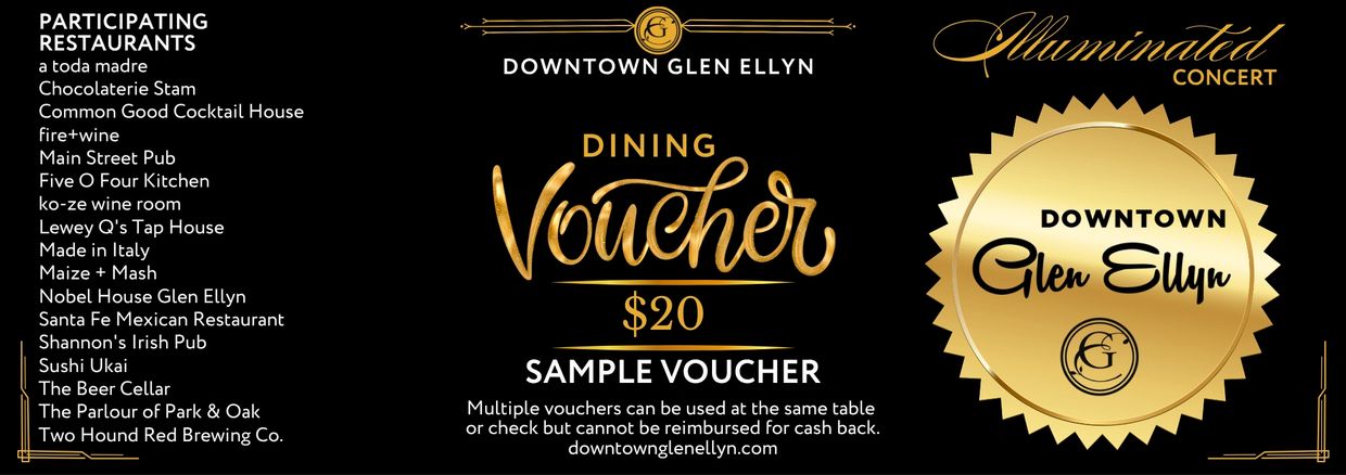 Your ticket also comes with a $20 dining voucher for a Downtown Glen Ellyn Restaurant. You will receive the dining voucher upon arrival at the concert which will be valid for 30 days from the date of the show. Multiple vouchers can be used at the same table/check but cannot be reimbursed for cash back.