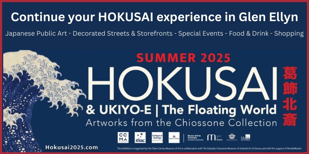 Glen Ellyn is celebrating Hokusai and Ukiyo-e: The Floating World exhibition with cultural experiences. Visit our themed public art, decorated storefronts, colorful dragon sculptures, lanterns, photo opportunities, specialty menus and cocktails, shopping, plus fun and engaging events all summer long!