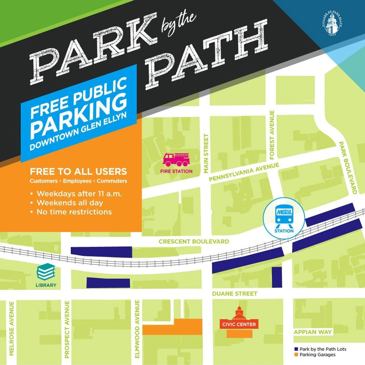 Glen Ellyn has street parking, two parking structures and Metra lots with timed availability. Public parking map below.